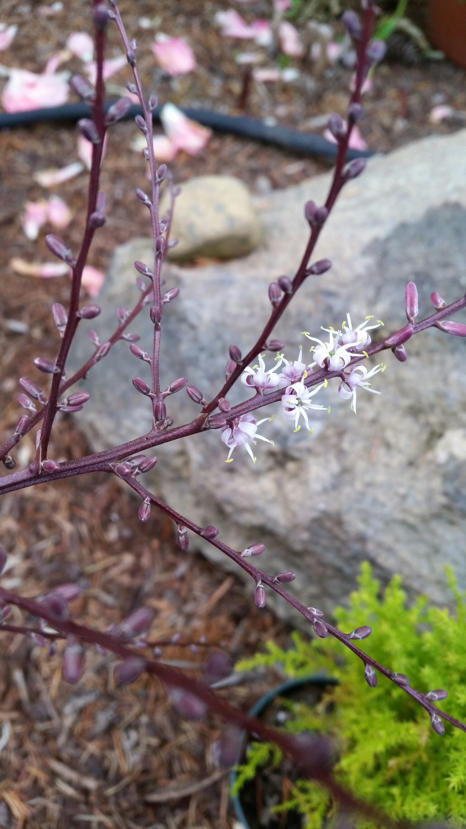 The Cordyline ‘Red Fountain’ was blooming! I had seen the flower spike emerge out of the deep red whorls of leaves several weeks ago. I had never seen any of my cordys bloom before, and wasn’t sure what this one would look like.