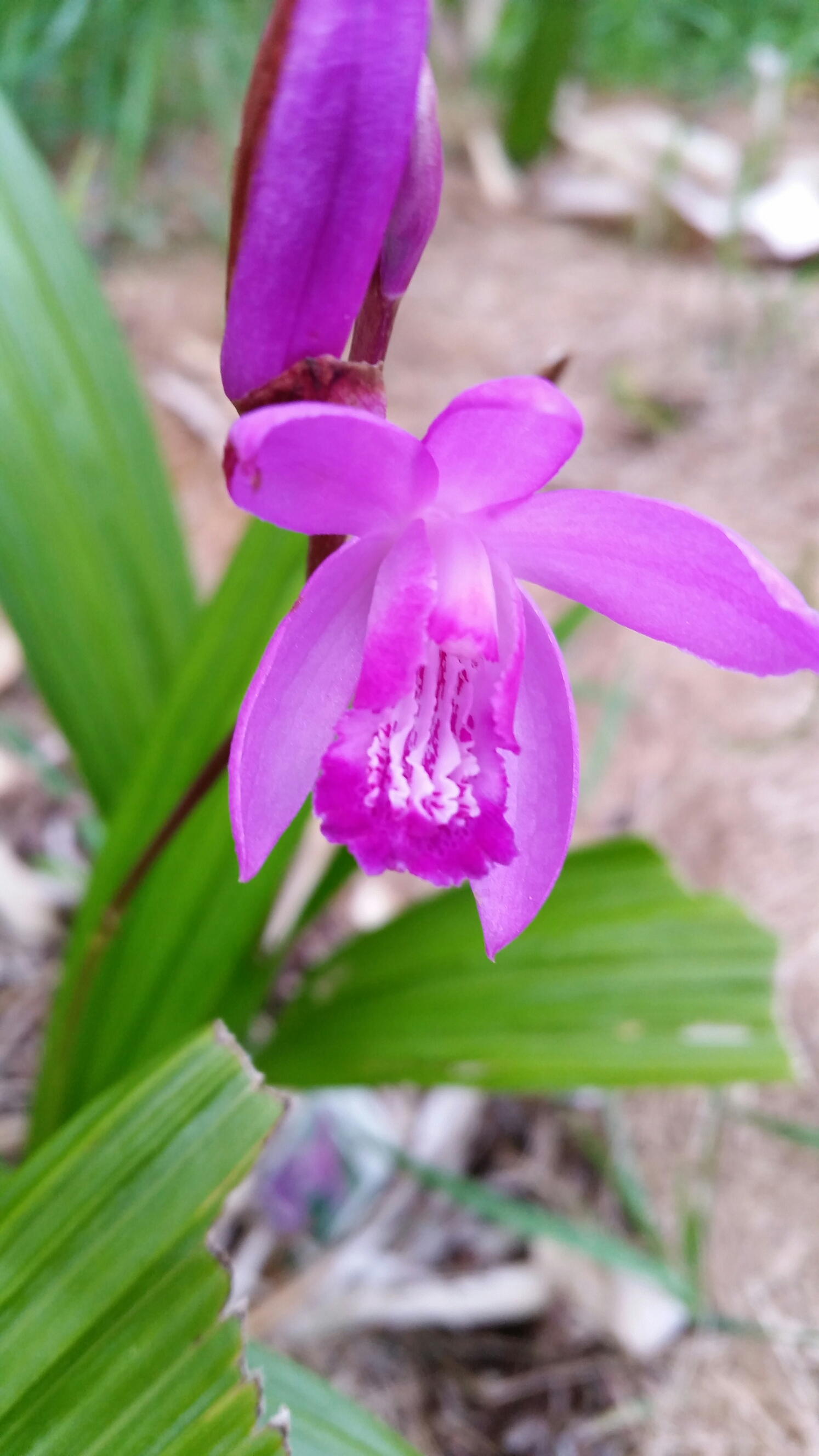 I won’t show you a full plant shot… it’s still a baby! Just a few feet over, it’s neighbor is blooming too. Bletilla striata ‘Big Bob’ has been in the ground for several years, but hasn’t bloomed much until this year. Unfortunately this year I also have a rabbit problem. The rabbits love terrestrial orchids. Especially the buds! Luckily a few have made it to full bloom.