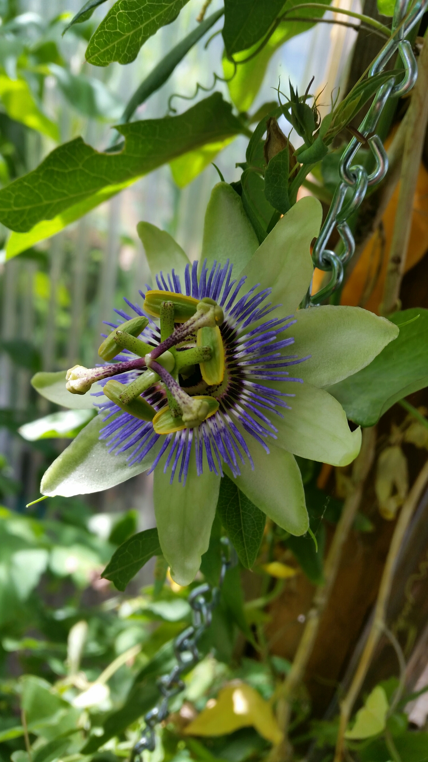 On the opposite end of the tropical-ish spectrum is this Passiflora ‘Clear Skies’. So hardy that it is nearly evergreen, it blooms like crazy and covers everything near it with deeply lobed leaves.