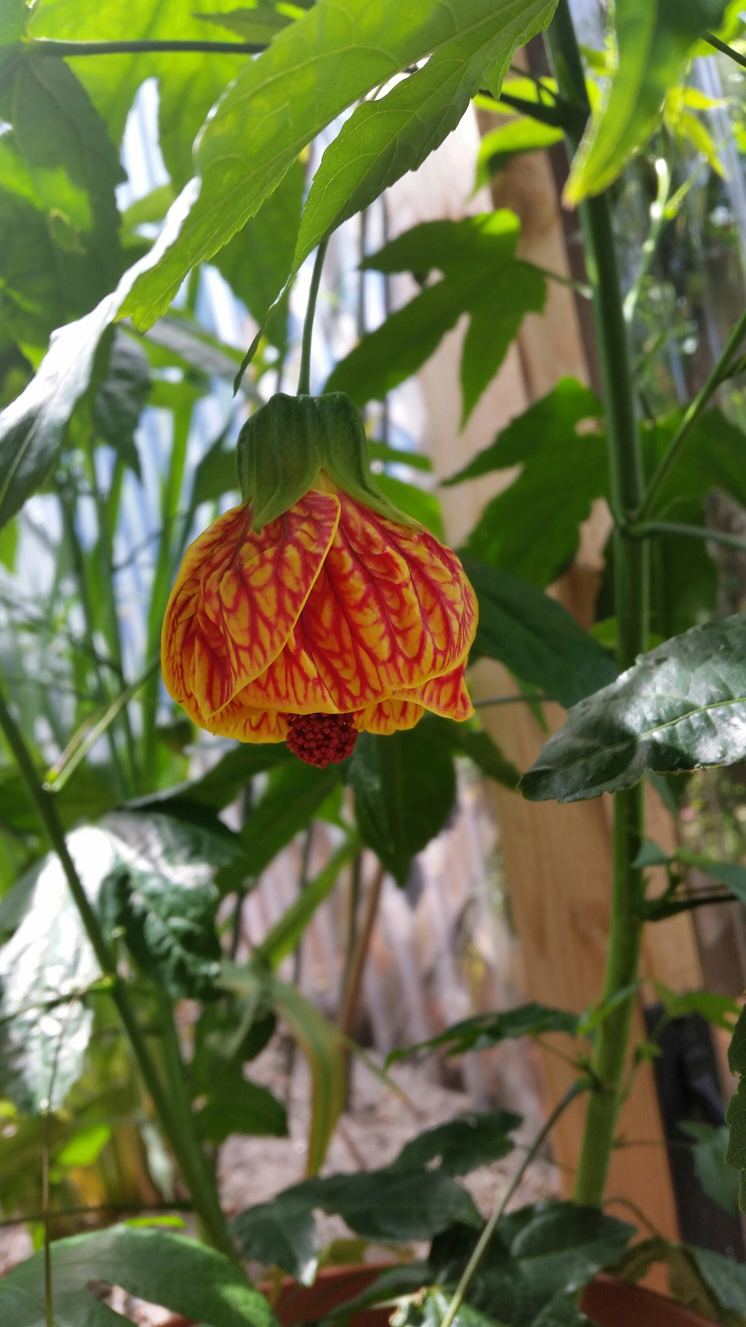 Abutilon ‘Tiger Eye’ is marginally hardy at best in my garden. This flower is on a potted specimen. The sole survivor of last winter is spindly and having a tough time catching up with this one.