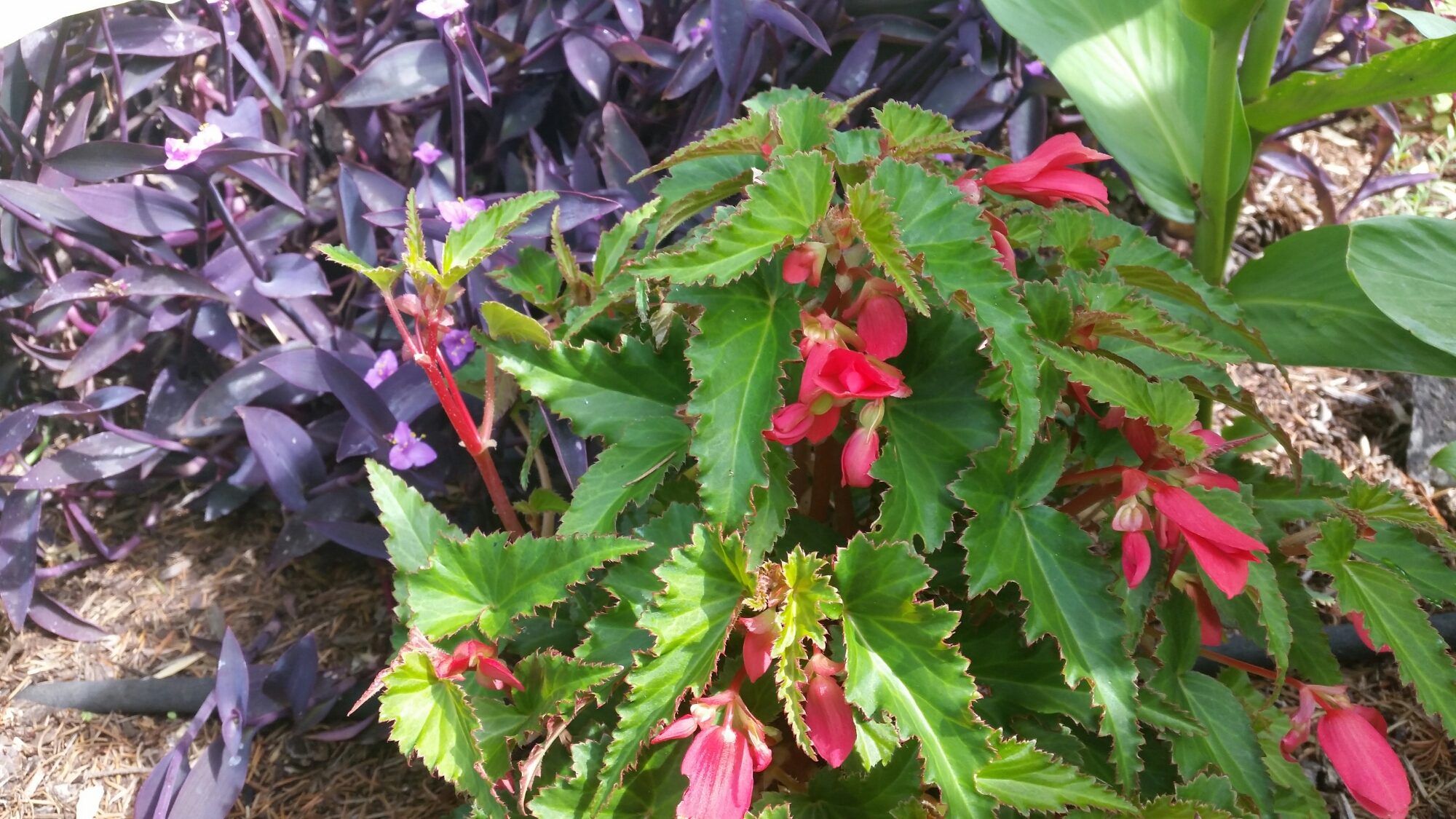 In the background, you can see Tradescantia pallida ‘Purple Heart’ with it’s tiny pink flowers. The real focus of this photo is the Begonia boliviensis ‘Santa Cruz Sunset’. I originally had a hanging basket with this begonia, and after losing the hanging pot over the winter I had volunteers appear in my garden. They have all been extremely hardy, going on 3 years now.