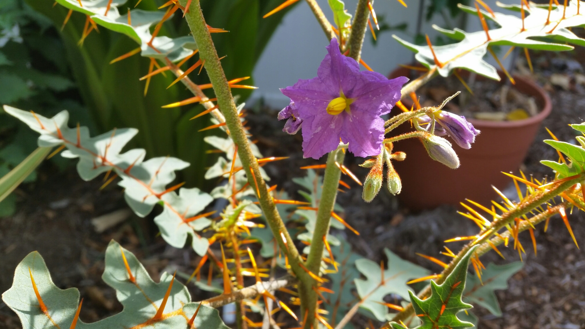 Solanum pyracanthum is viciously awesome. Each spine is hard and sharp, even when small. The colors are amazing too. I think the bright orange spines look killer against the mint green leaves. This is one tomato I won’t be eating.