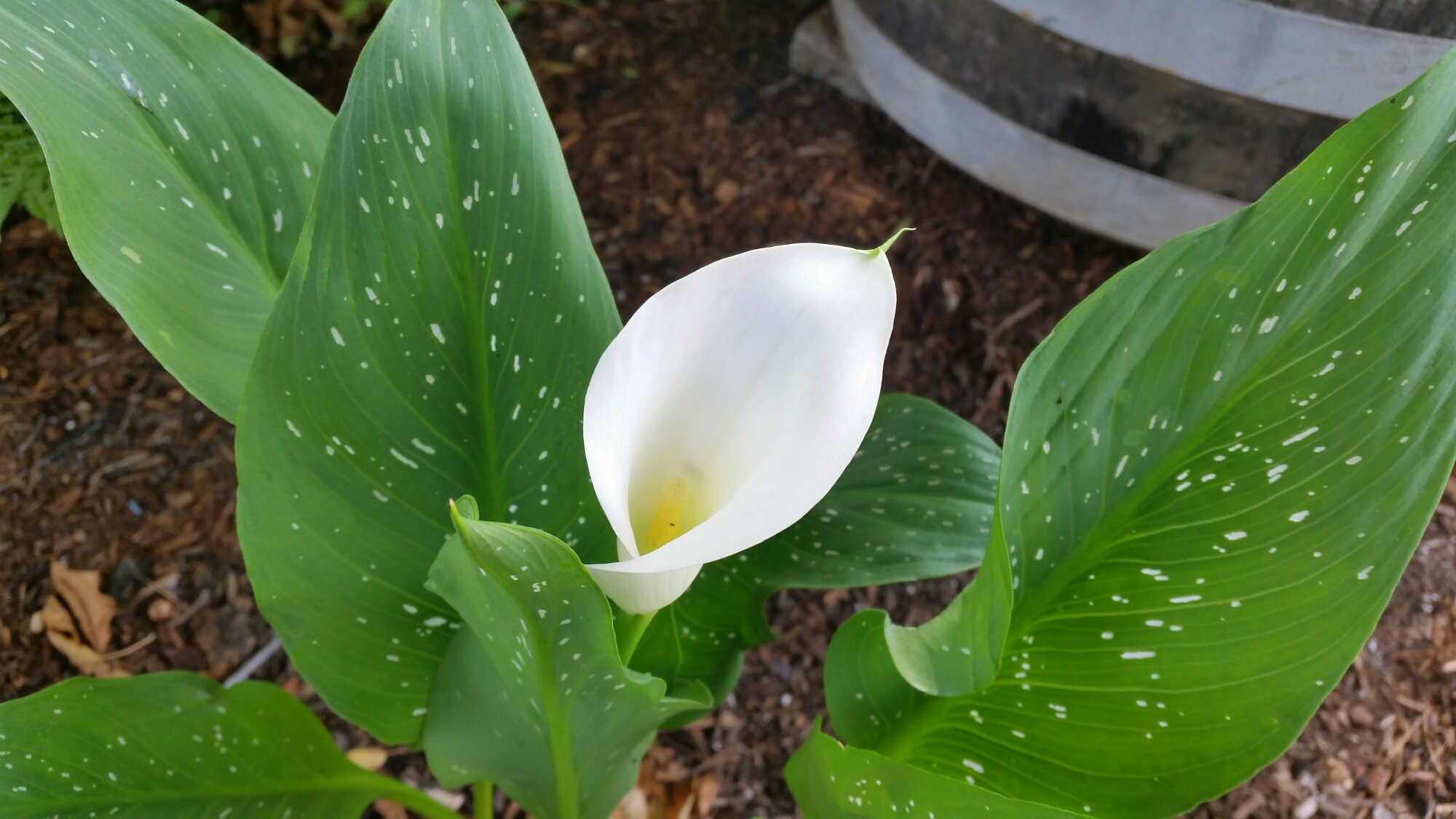 The calla bulb mix that I planted has bloomed for the first time at 3 years old. I know now that there is at least a white one in there!