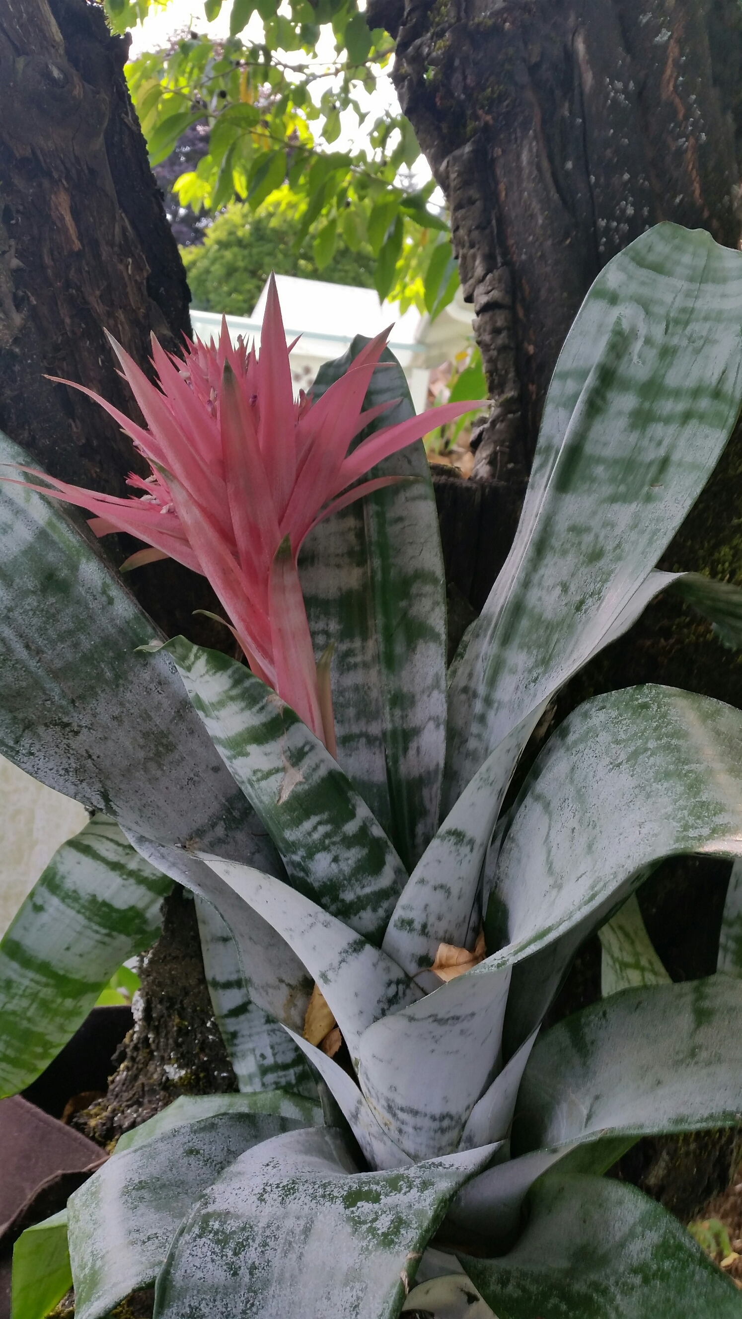 Aechmea fasciata ‘Primera’ is a bromeliad that you can easily find at most grocery stores in April, but I still like it. With large leaves and a neon pink and purple inflorescence, it is easy to see when I put in in the branches of my cherry tree.