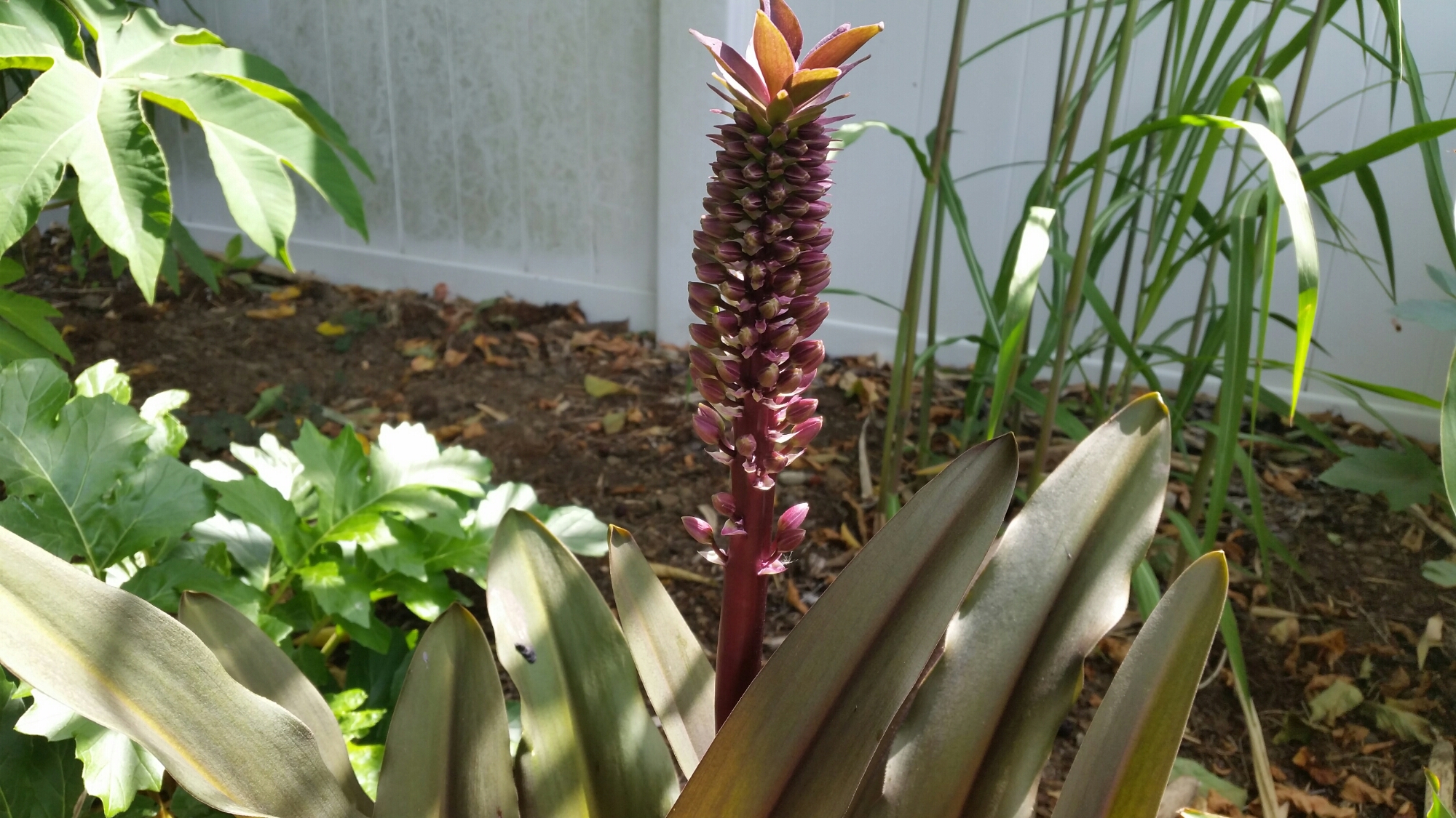 Eucomis ‘Sparkling Burgundy’ is sending out it’s pineapple-esque flower. Having planted it next to ‘Sparkling Beauty’, I am glad that I kept the label with each plant.