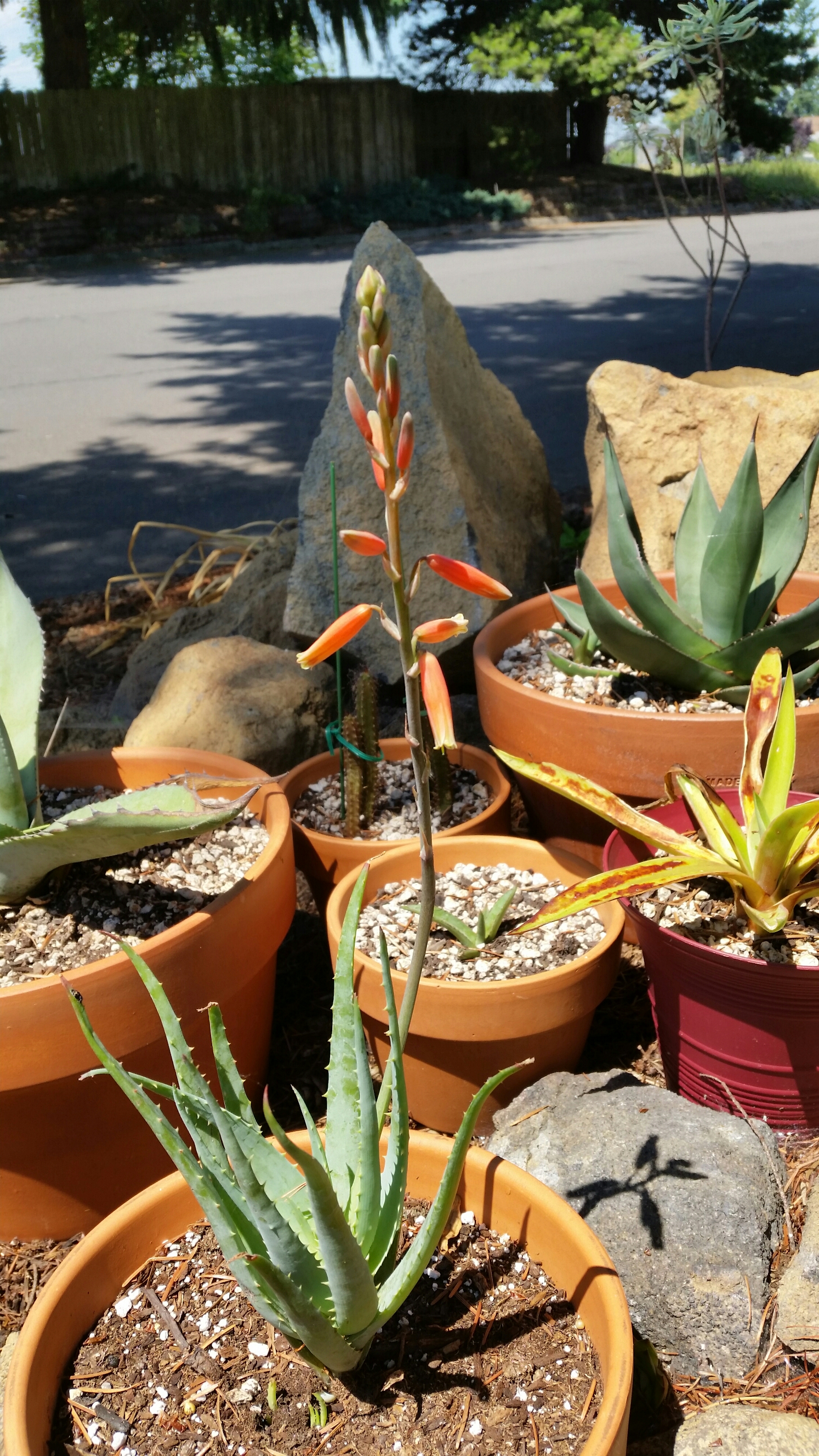 Now that the blooms have appeared, I am more convinced that I have a ‘Blue Elf’ aloe. The pictures I have seen of little elfy have all had orange flowers… so hopefully I am not making a mistake. As you can see in the pot, there are a couple of pups popping up next to the main plant.