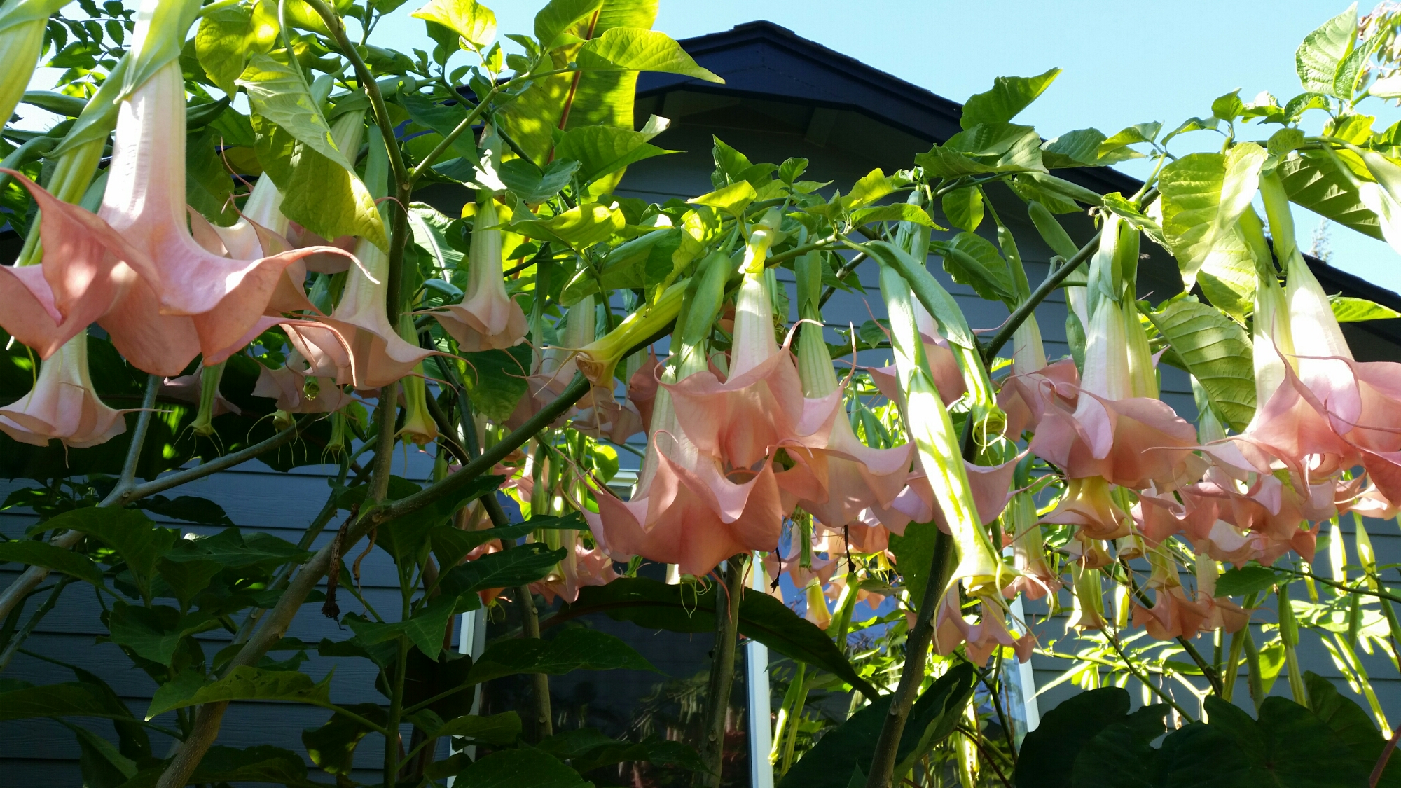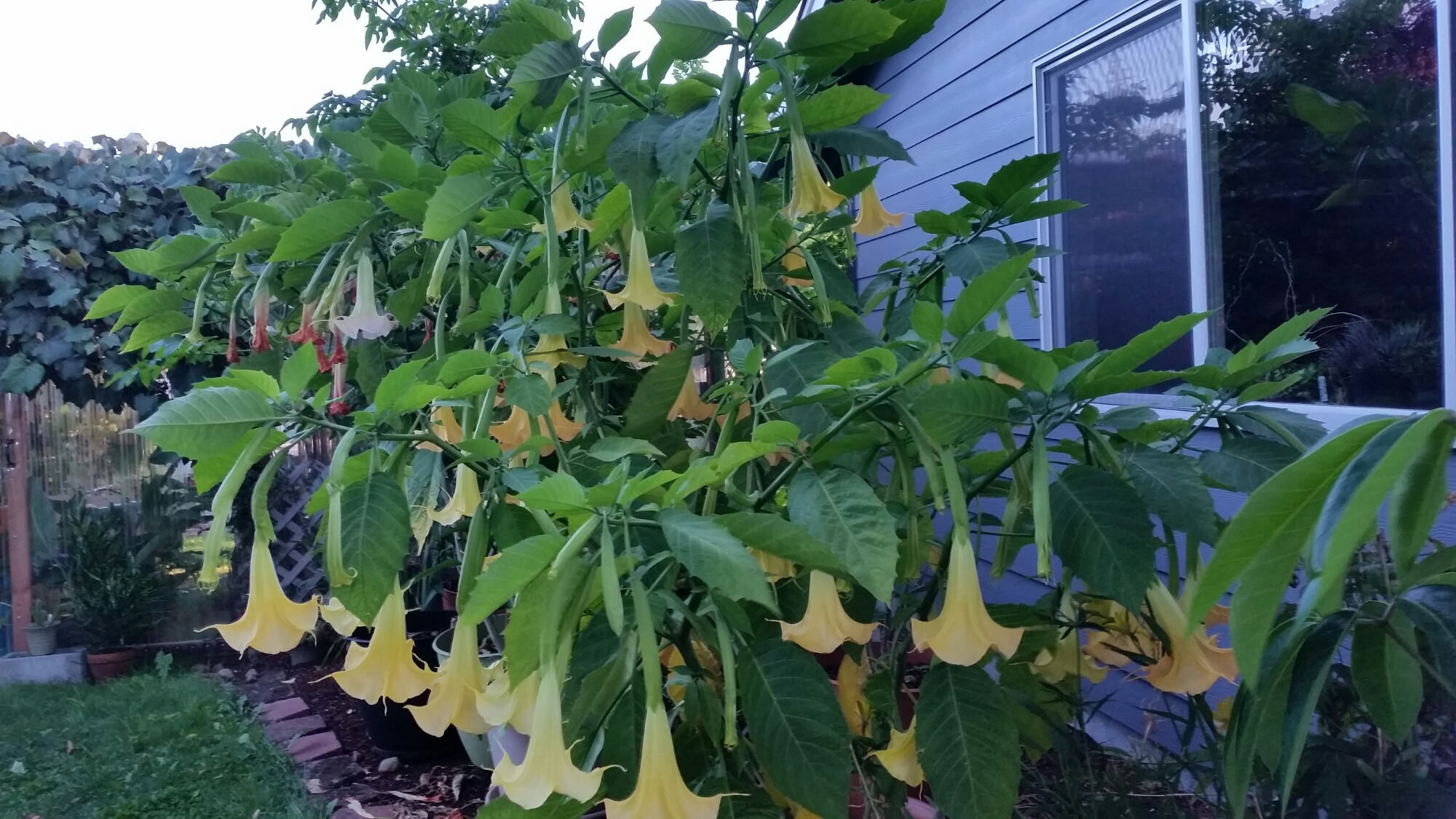 The brugmansia have not disappointed this year. After I figured out a way to keep the spider mites from destroying them 3/4 of the way through summer, they started rebounding. Running a sprinkler on the leaves every morning did the trick. Now, every few weeks they have a flush of blooms, with more blooms each time.
