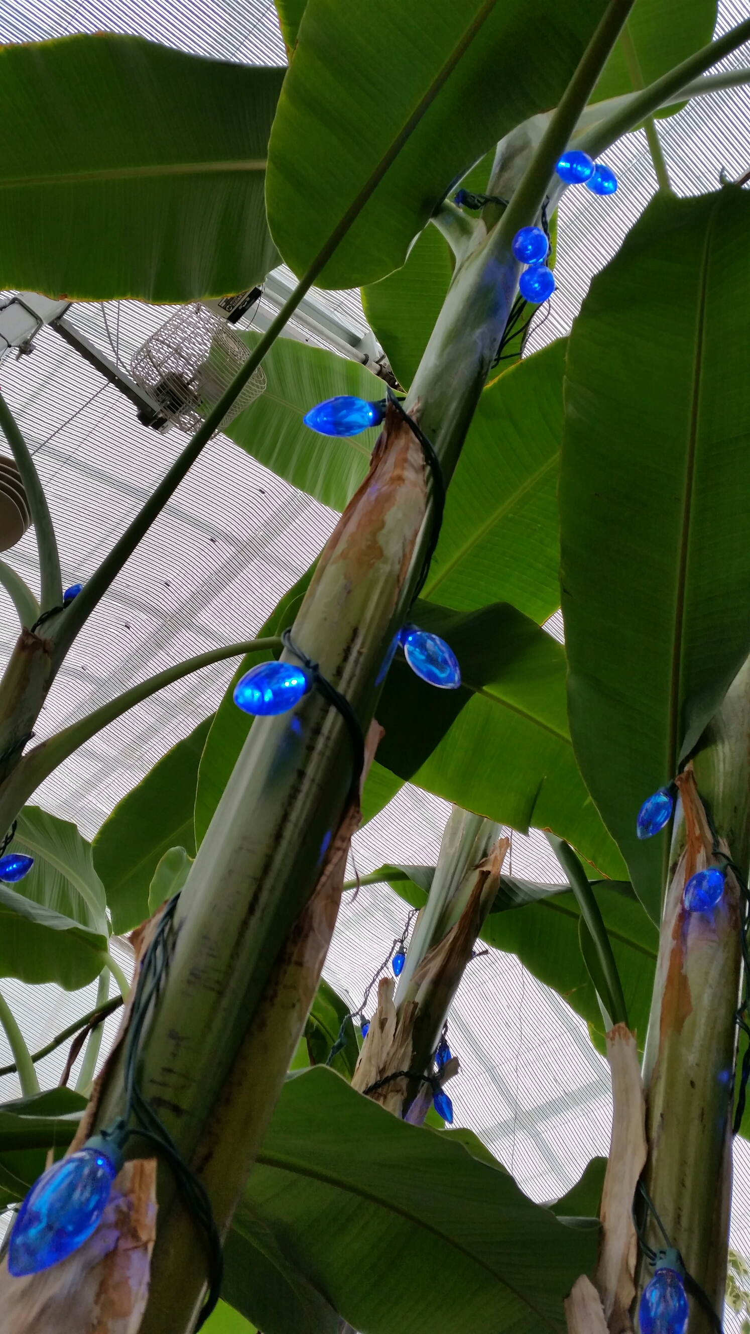 Some of the bananas have lights in them! I would guess that the lack of branches or anything low on the stems would make it difficult to hang lights from them.