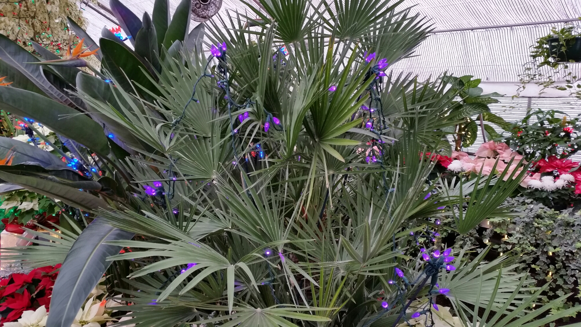 The Mediterranean Fan Palm (Chamaerops spp) has purple lights in it. I am not a fan of Christmas lights in plants, but for just a week a year it’s a nice bit of holiday cheer.