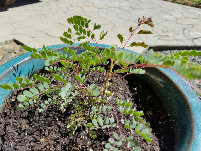 Pride of Barbados, Caesalpinia pulcherrima, survived a freezing winter last year in a small pot, as a fresh seedling nonetheless. I am very surprised that it appeared again this year. It’s still small, but maybe next year it will bloom.