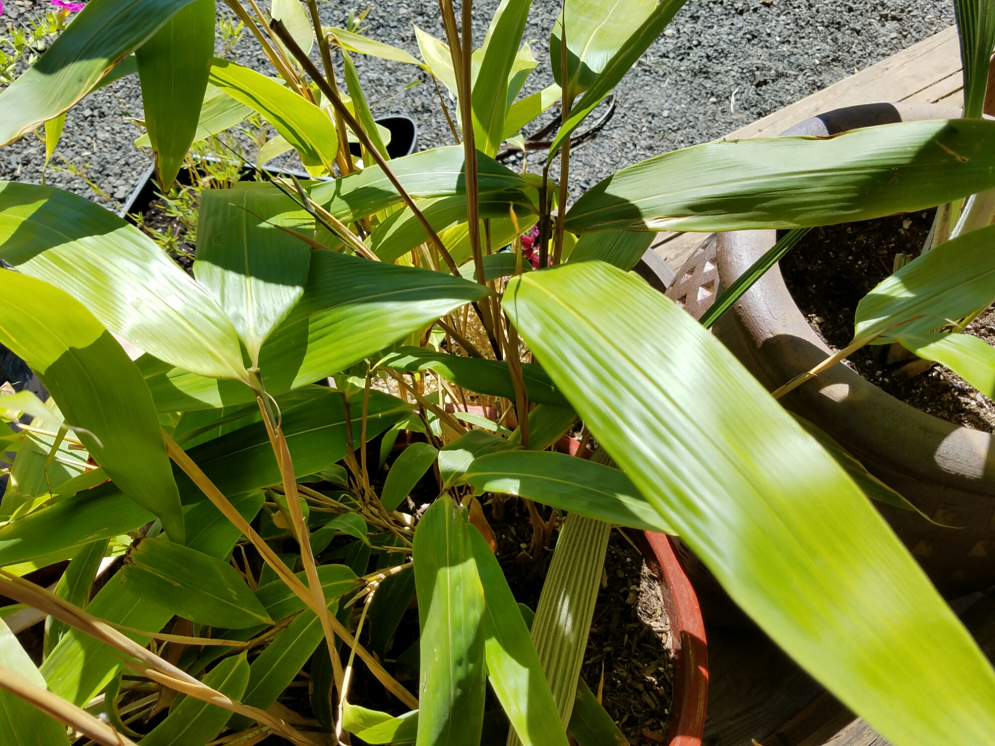 Indocalamus tesselatus, big leaf bamboo, not totally fried by the sun yet.