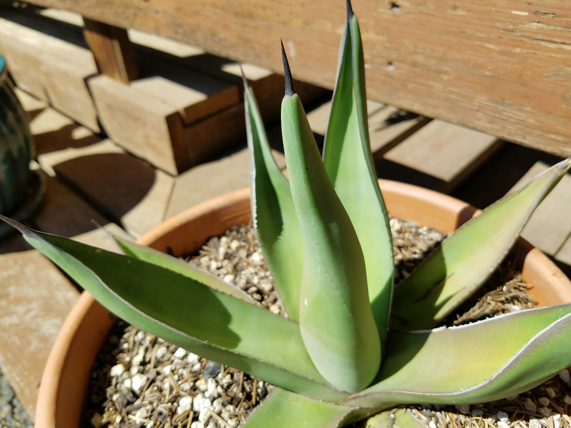 The Agave ‘Sharkskin’ that I got a few years ago has been doing great, with the unusually hot and dry year we’ve had so far. The leaves all look good, which is unusual for agaves in my care.