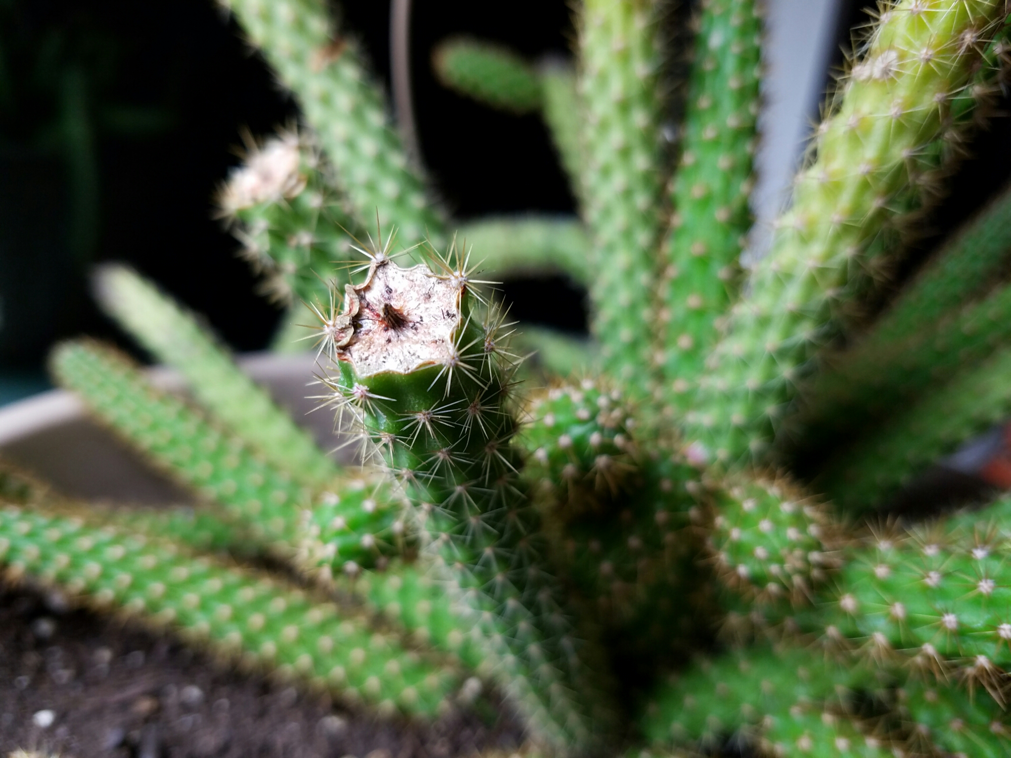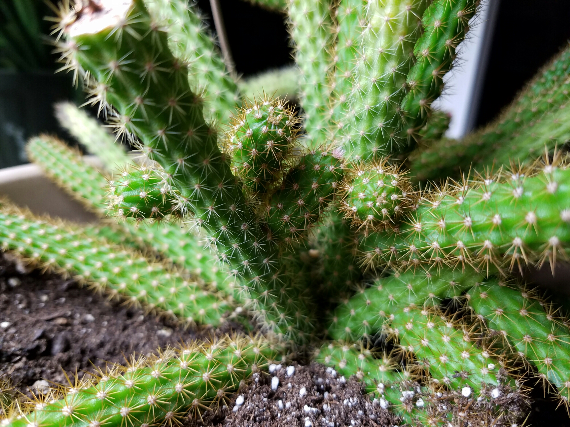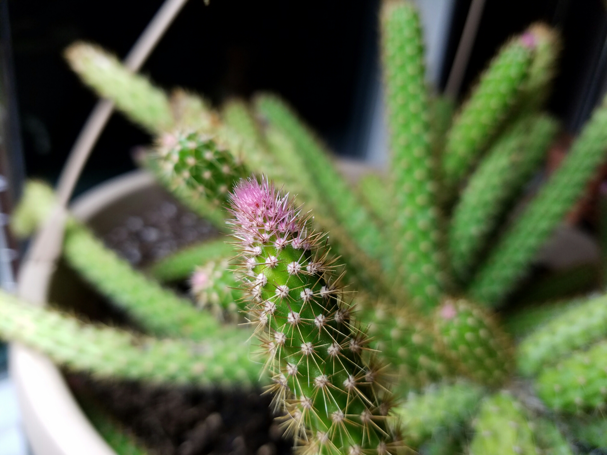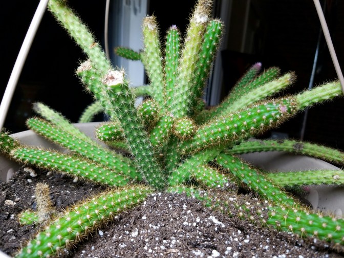 It is really looking better recently. I think it likes sitting on top of a fluorescent light. You can easily tell where the new growth is occuring by looking for the soft pink spines. Once they lose that neon hue, they aren’t quite so soft. Not deadly, but not comfortable.