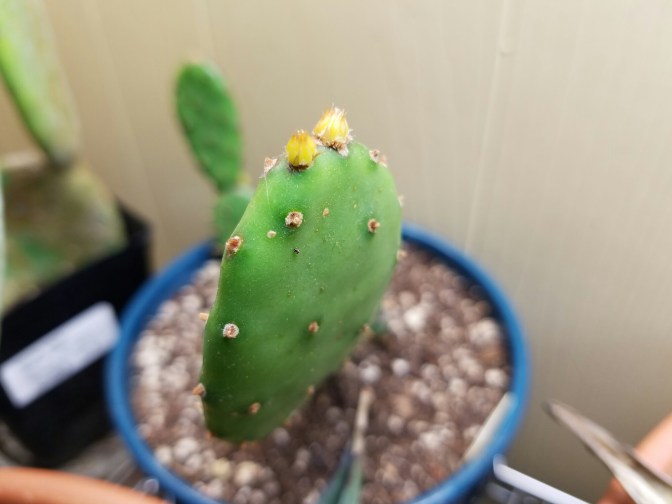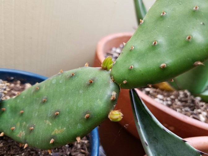 I have another opuntia next to this one. Another spineless variety, it is a small Opuntia ellisiana. I haven’t noticed anything happening with it, new growth or otherwise.