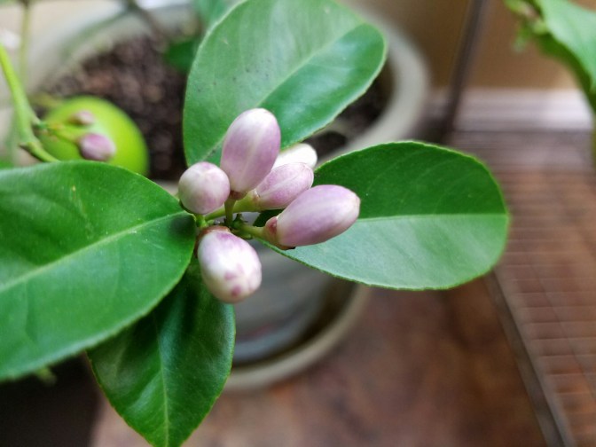 Things are growing fast here at Big Leaves. Right on cue, the Meyer lemon has been blooming and filling the sunroom with it’s sickly sweet smells.