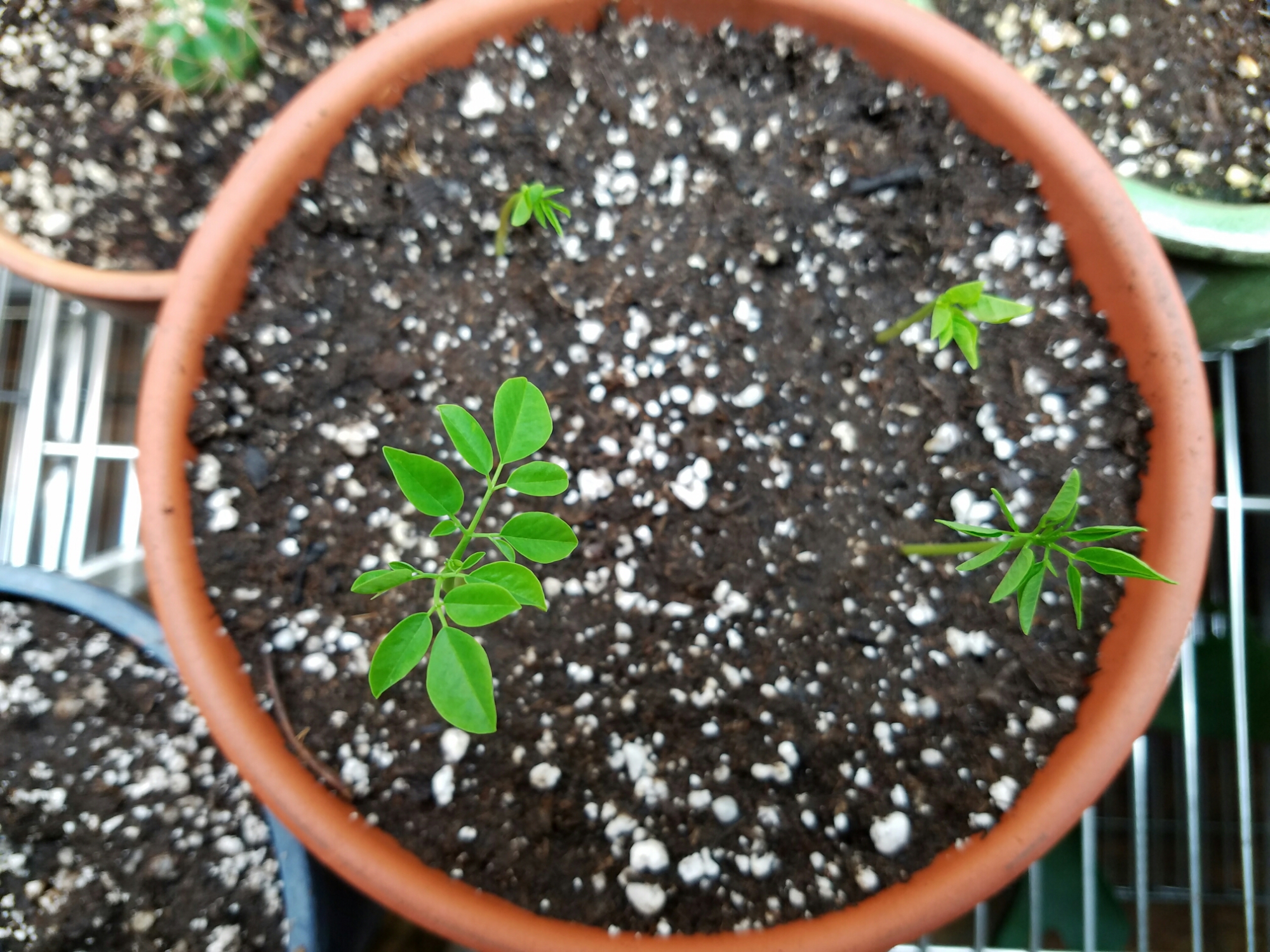 Remember the Moringa oleifera seeds I planted 11 days ago? After a few days they started to germinate. Now, after a few more days, they are between 4 and 5 inches tall.