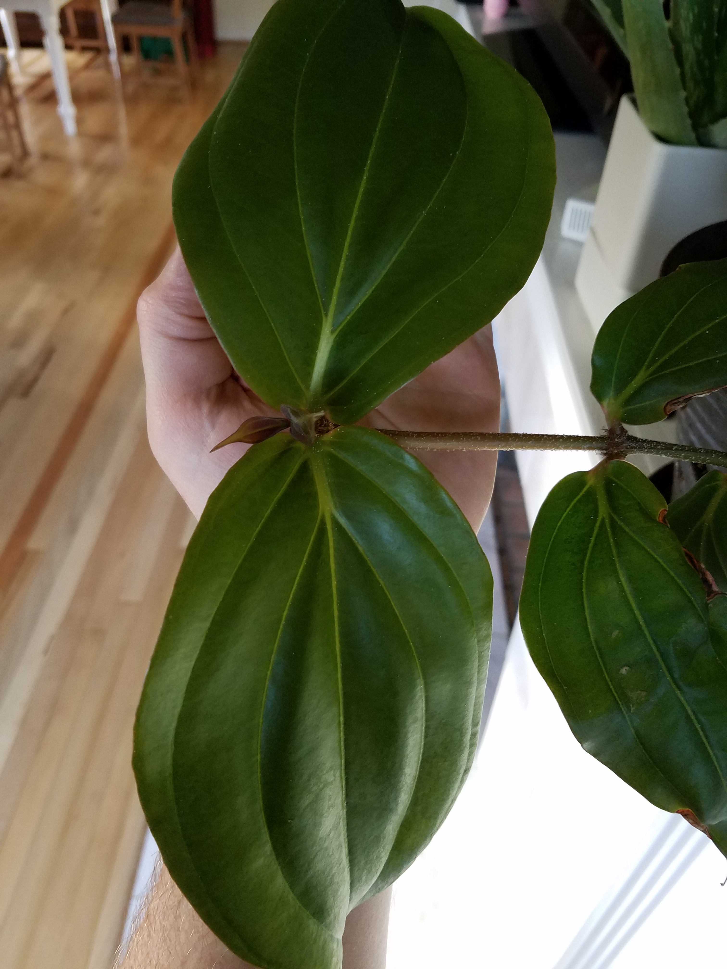 The latest set of leaves to show up have started looking a lot like the vibrant green and copper tinted wings that I saw on Kauai. Whatever I’m doing, I’m going to have to continue doing. These leaves are huge!
