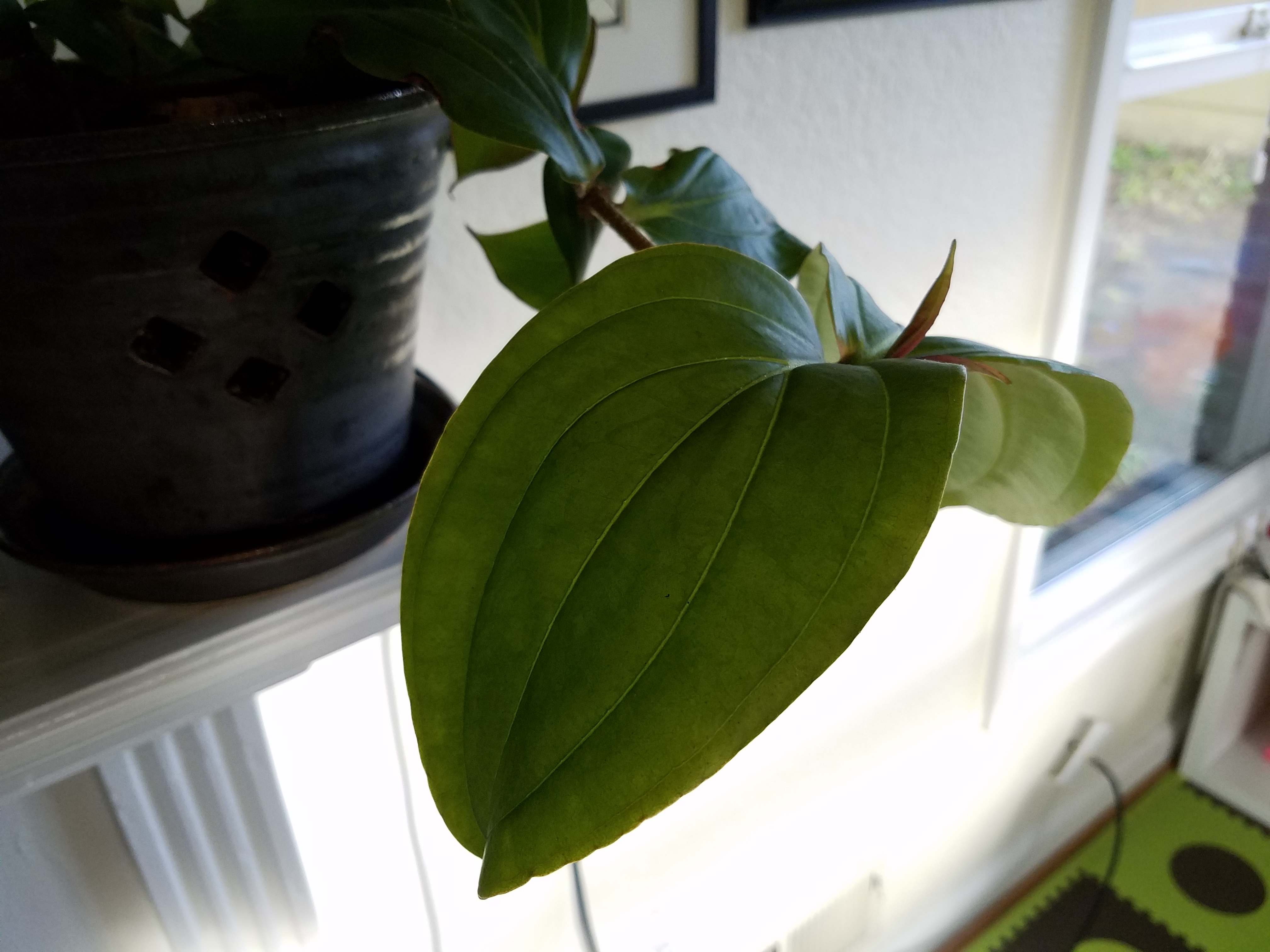For the first few months Kinabalu lived in a large plastic bag in an attempt to retain humidity and a little bit of heat. It grew some, but the leaves were small and twisted. The leaves looked nothing the green parasols I saw back on Kauai. Being from the Philippines, I was guessing that when exposed to the 30% humidity of eastern Washington my poor Medinilla would shrivel up like wrinkled tissue paper. Needless to say, I was very hesitant to get rid of the plastic force-field. After I began noticing exudates (sugar-like crystals on the outside of the plant) I knew something needed to change.