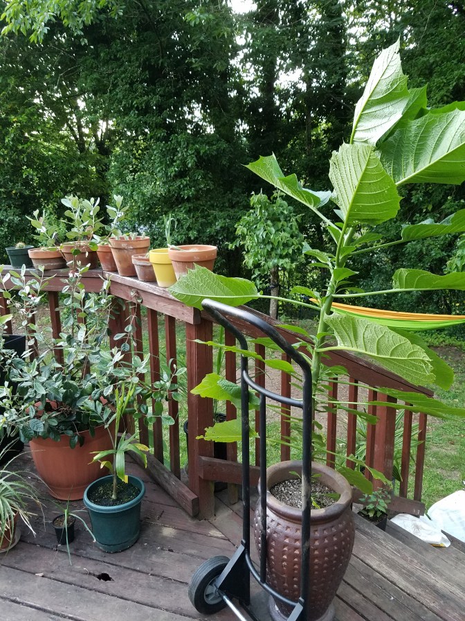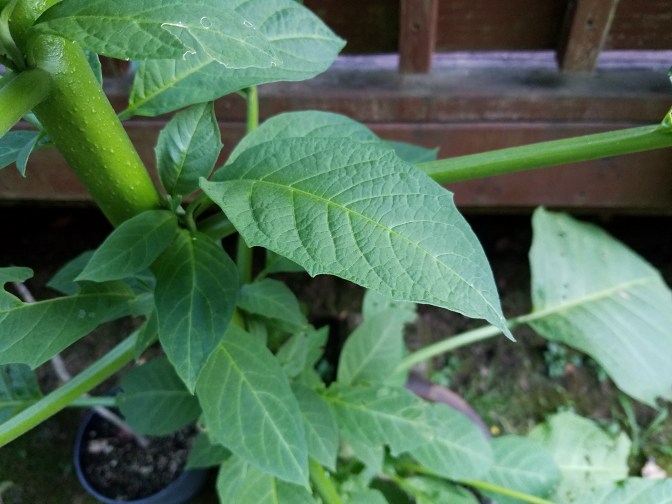 It is now officially summer, and the brugmansias have been placed in their summer homes. ‘Charles Grimaldi’ and ‘Naughty Nick’ live in the back yard on the north side of a raised deck. They get a small amount of shade, especially in the lower sections. As long as I keep the roots somewhat moist, they seem to be happy. ‘New Orleans Lady’ lives in a nursery pot on the front porch, looking pitiful. It doesn’t mind the heat, it seems. However it did get hit pretty hard by flesh eating bacteria this spring. Not really, but it looked like it. Sitting in the greenhouse with water-holding potting soil caused a lot of edema, which in turn ruined a lot of leaves. For those of you who don’t know what that is, check out the Missouri Botanical Garden page on edema. It looks like a viral disease, or even a fungal problem. Luckily, it’s neither.