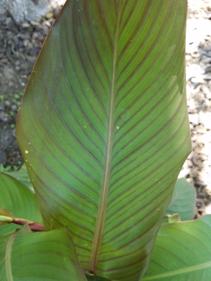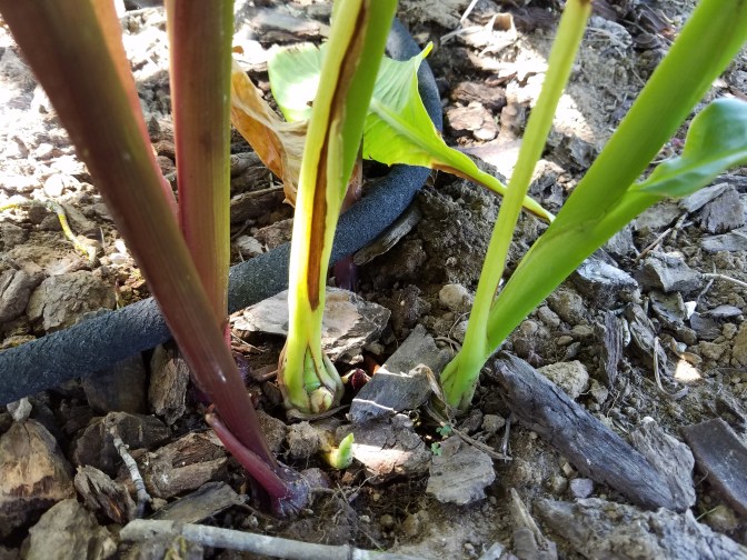 Back in 2015, when I had quite a forest of Canna musifolia, I collected seeds from the many flowers that eventually turned into pods. I wasn’t sure if many of the seeds would hold true to their ‘banana’ form, so I collected as many as I could and labeled them as to which plants they came from. I have yet to germinate any of the seeds from the green-leaved/orange flowered form. Everything this year has been from seeds collected on the banana cannas with green leaves and red margins, red stems and red flowers.
