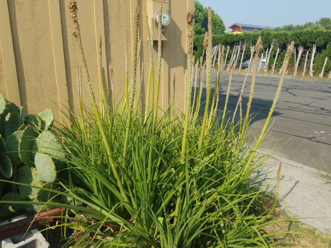 I’m not sure how long this clump of cactus has been growing here, but it seems to be doing incredibly well on the south side of this building. I couldn’t find evidence of winter rot on a single pad. I bet it has excellent drainage.Cactus tuna! You can see the remnants of a single flower on the leftmost fruit. I’m guessing it was yellow.The Kniphofia looks like it’s doing well, too. I wish I could have seen what color the flower spikes were. At over 6 feet tall, this is a very impressive display.