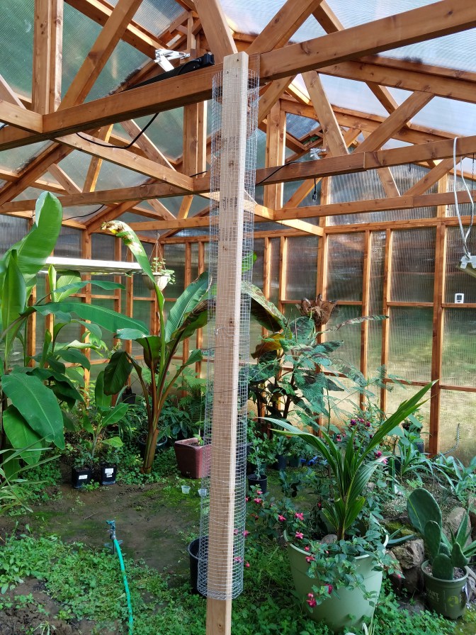 I remember back at Butterfly Gardens in Auckland, there were some really neat pillars in the greenhouse. They were huge, and were basically heavy gauge wire fencing that were bent into columns and filled with rocks. I bet in the long run the rocks and heavy wire they used will be great, and low maintenance. Unfortunately my greenhouse is a little small for that.