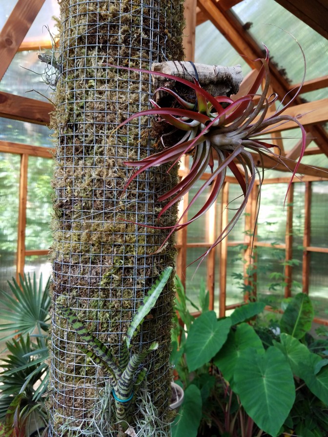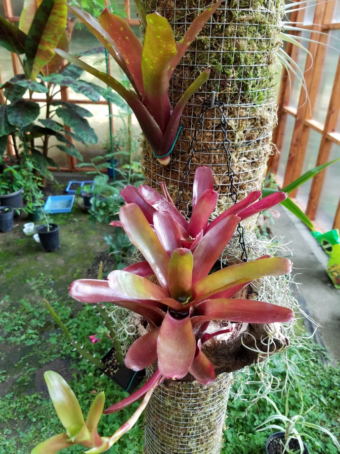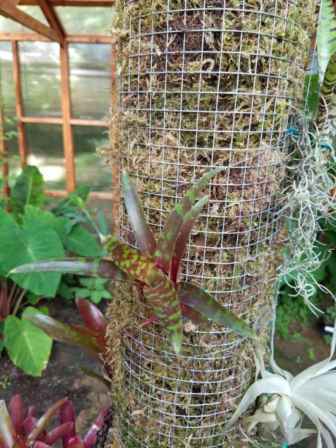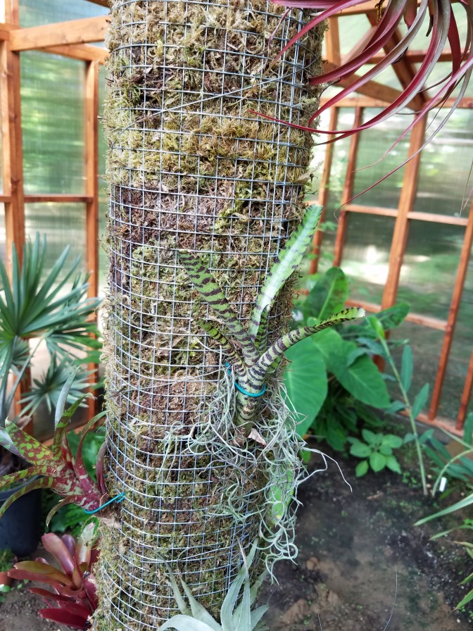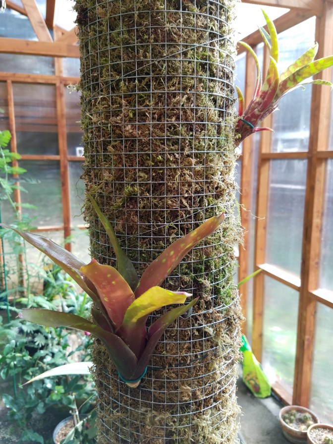 I’ve had this crazy idea recently… I need a bromeliad pillar in my greenhouse! It’s warm and humid in there, and it gets plenty of sun in some areas. I need more neat tropical elements. I’ll probably end up with a few vines climbing up the pillar, but really, bromeliads are just what I need. I already have several broms, and now there is room for more.