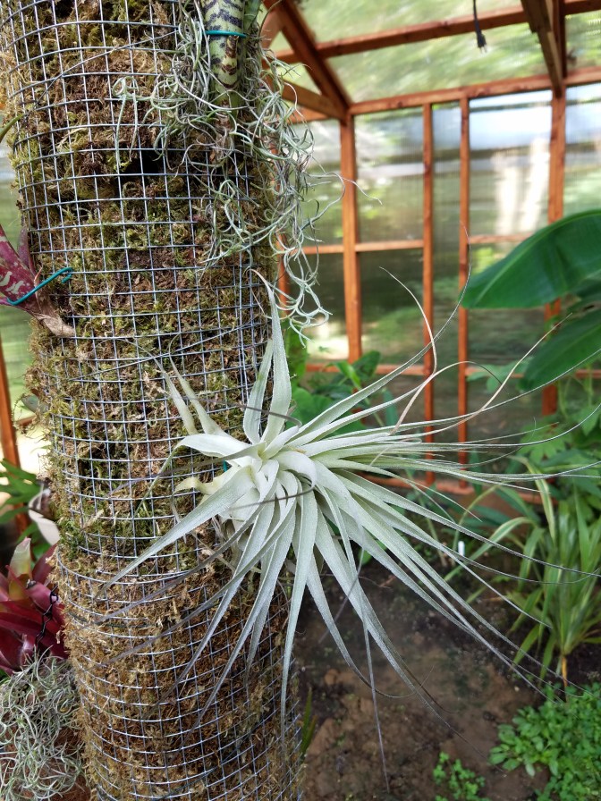 As you can see, I have a few bromeliads and tillandsias attached to the pillar already. The Neoregelia ‘Fireball’ pot is just hanging on a hook, since I already potted it up so nicely. Other bromeliads that have migrated to their new home include N ‘Wild Tiger’, Tillandsia brachycaulos, T gardneri, T usneoides, and a few other unidentified terrarium bromeliads.