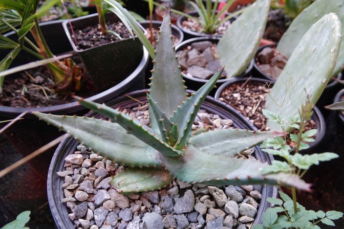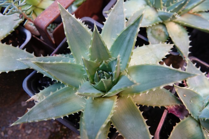 I wish that I knew the name of this one. Aloe microstigma? Aloe marlothii? Aloe ferox? I’m no expert. I bought it at a yard sale, with no tag of course. As I’ve gradually exposed it to stronger sunlight since I got it, the color has become a vivid silvery blue in person. Incredible!