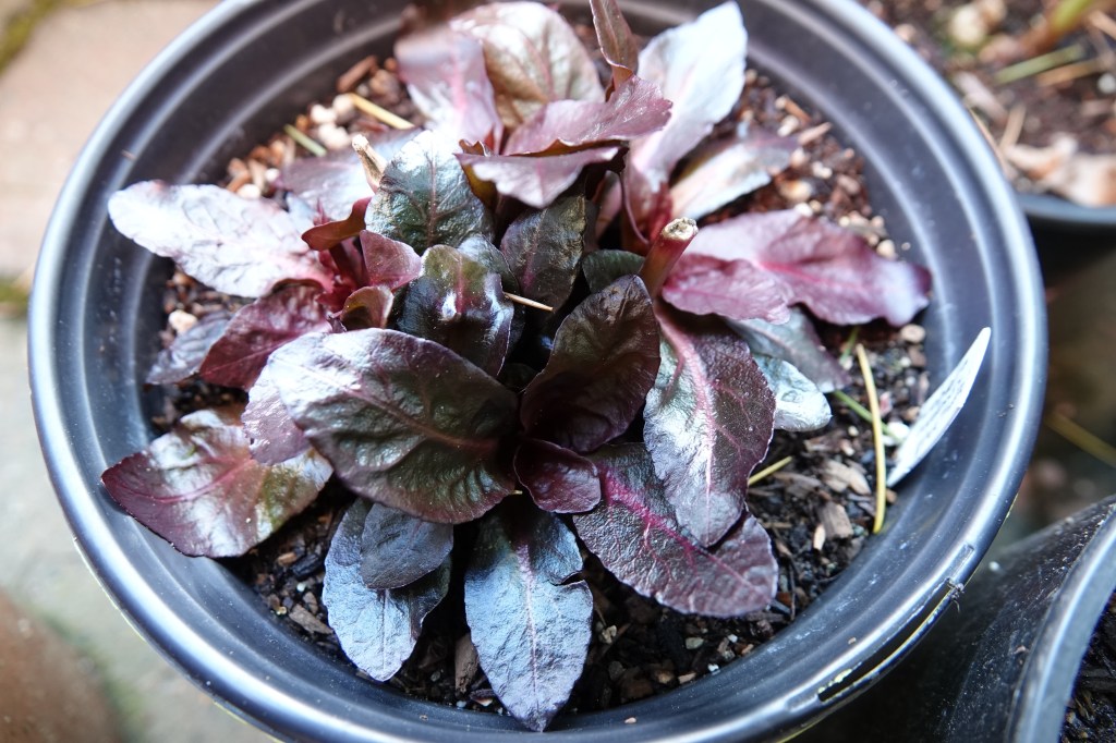 Lobelia cardinalis ‘Black Truffle’ is throwing out some really dark purple leaves, nearly black in the center of the rosette. The parent plant of this clump was over four feet tall last August. Let’s hope some of these approach that height. On that note, my seeds were open pollinated and there were Lobelia tupa a moderate distance away…