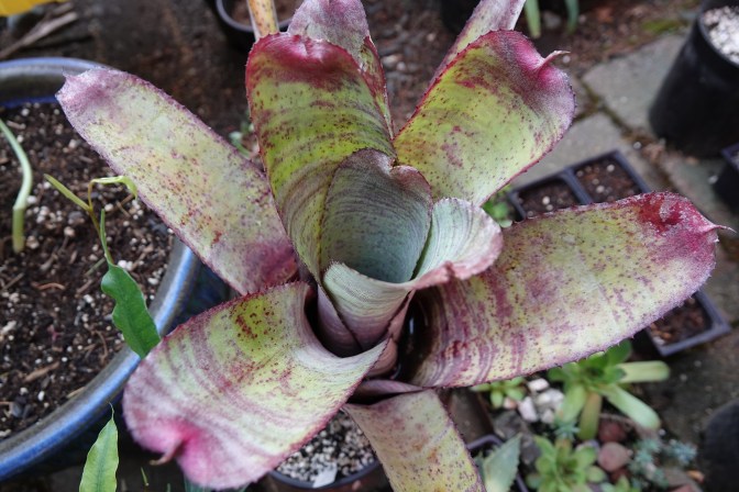 A couple of bromeliads have made it outside recently, and they might have benefited from making the migration a little earlier. Vriesea imperialis (or Alcantarea imperialis as it used to be named) is a true giant of the brom world. It is a terrestrial bromeliad, and so takes roots as seriously as most other plants I grow. From my experience with them in the past, they do more growing during the spring and fall than in the summer. The more overcast and rainy days, the better. Larger leaves, darker color and a fuller rosette all come from those conditions. The last monster that I had the pleasure of taking care of grew to nearly 4 feet across. It never put out any pups, unfortunately. My current stock of V imperialis is a little different. There are plenty of pups! I’ve got a pretty large Billbergia hybrid that has moved outside now too. With hybrids of this genus, I am completely lost. I’m guessing that there is a little bit of B vittata in there, given the horizontal stripes and upright growth.